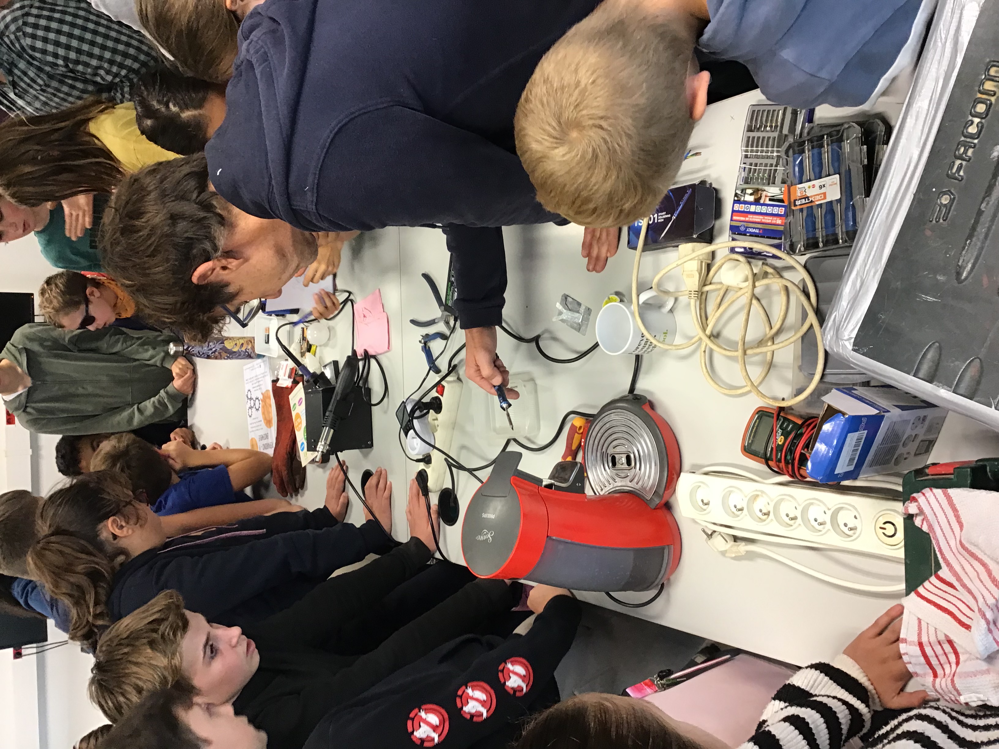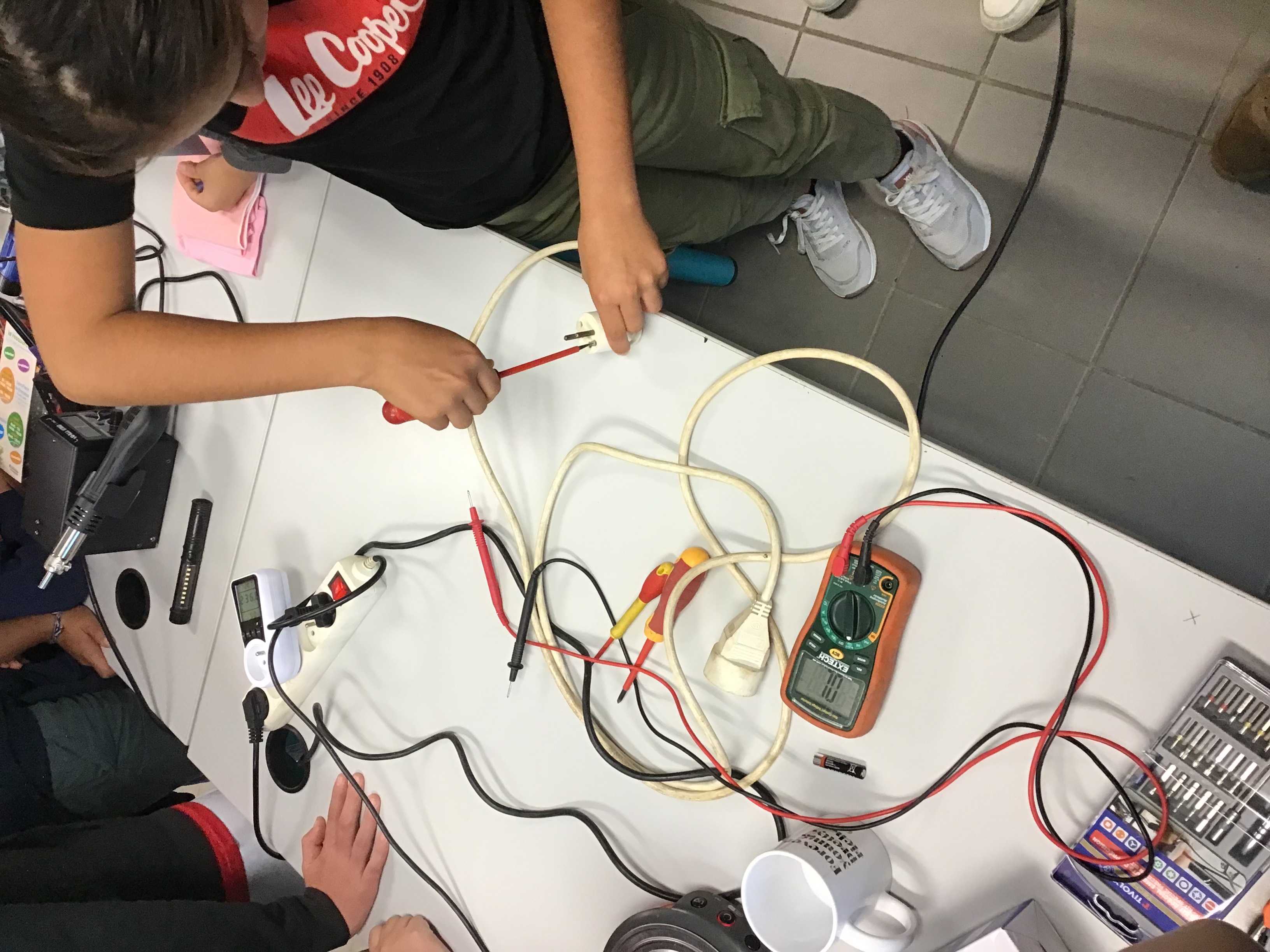 Les élèves ont pu utiliser du matériel tels que fer à souder, multimètres, capteurs thermiques... pour réparer des rallonges, des lampes ou ampoules.